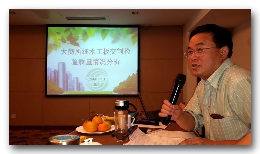 大會結(jié)束后意猶未盡的客戶們又聚集在小會議室進行了討論。上海木材檢驗所陶所長和田工程師對兩板交割中板材的質(zhì)量要求及需要注意哪些方面專門做了PPT進行講解。會議取得了非常好的效果。