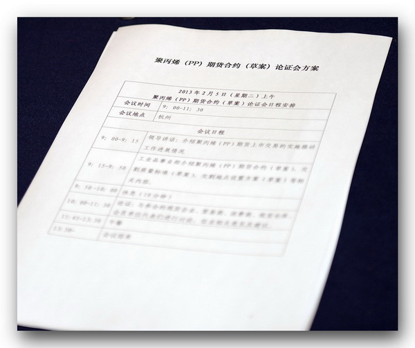 2013年2月5日上午,大連商品交易所工業(yè)品部在杭州三立開元大酒店四樓召開了聚丙烯(PP)期貨合約論證會(huì),我司金方云總經(jīng)理及期貨專員被邀請(qǐng)參加了該次論證會(huì),參加會(huì)議的還有現(xiàn)貨企業(yè)、貿(mào)易商、消費(fèi)商、現(xiàn)貨倉(cāng)庫(kù)、會(huì)員單位的代表。大商所工業(yè)品事業(yè)部介紹了聚丙烯期貨合約(草案)、交割質(zhì)量標(biāo)準(zhǔn)(草案)。交割地點(diǎn)設(shè)置(草案)等相關(guān)內(nèi)容。會(huì)議在12點(diǎn)圓滿結(jié)束。